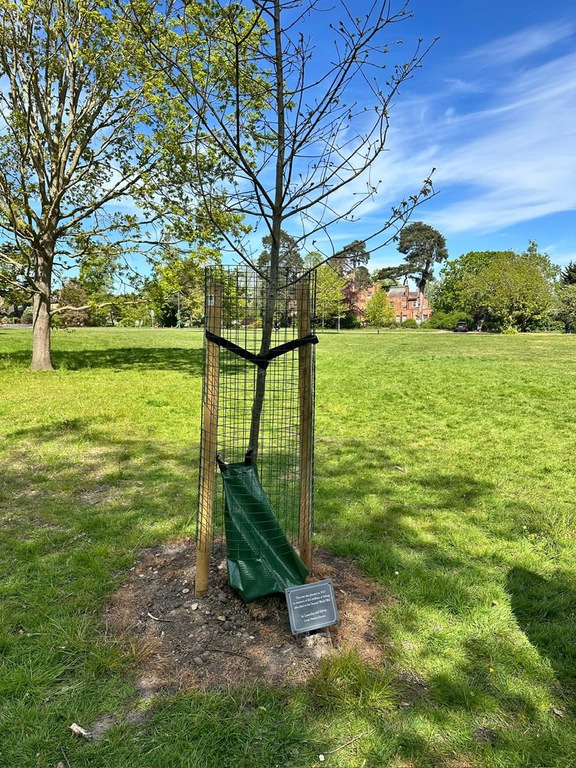 The tree and plaque are located at the north-east part of The Green (nearest St John’s Church, at the opposite side to the War Memorial), close to the east path.