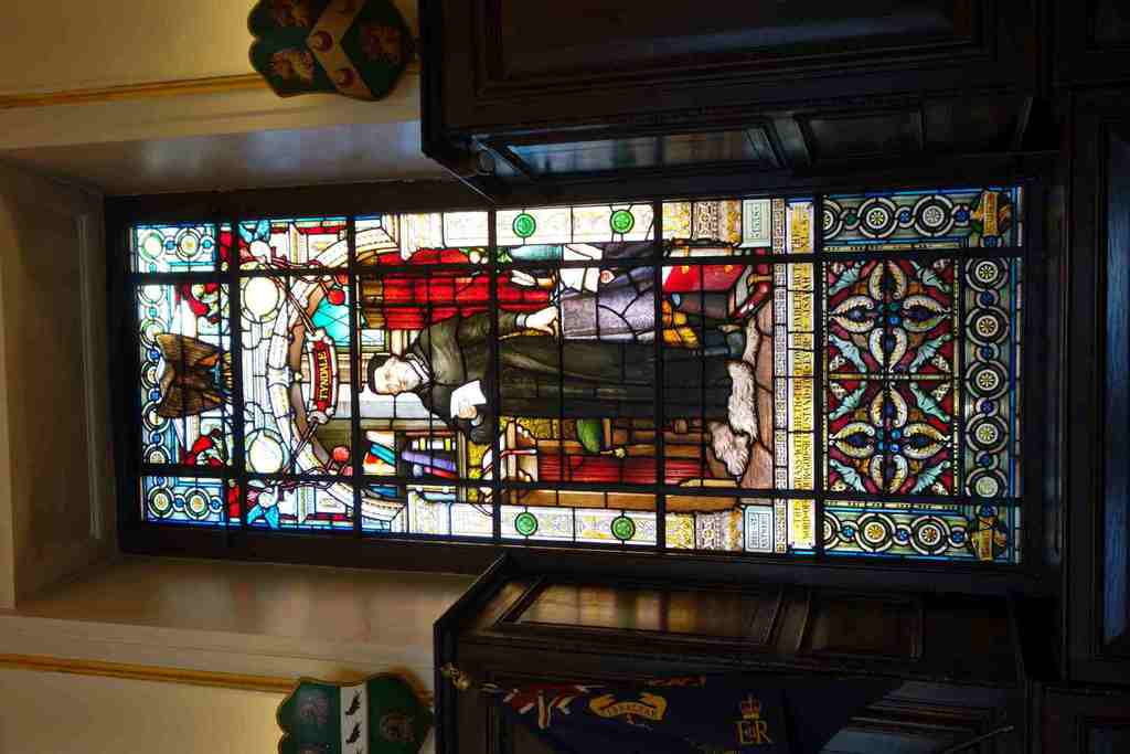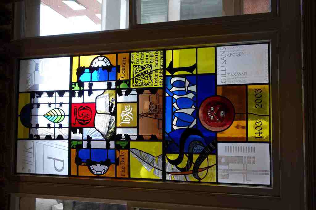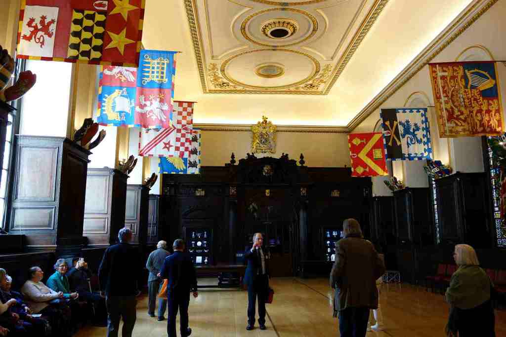 Our knowledgeable guides led us through the magnificent rooms of the hall. In the court room we were taught how to bow and curtsy should a member of the Royal Family come through the door. We learned about the history of copyright and saw the Stationers' Company register showing the entry for Shakespeare's First Folio in 1623. In the main hall impressive stained glass windows depict figures like William Caxton, who introduced the printing press to England, and William Tyndale who translated much of the bible into English.